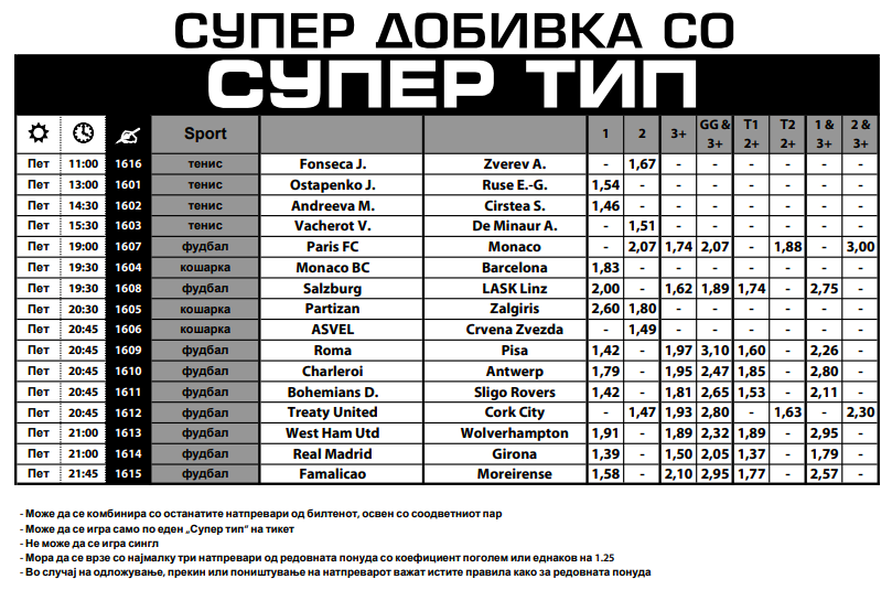 Понудата ја отвораат тениските натпревари во 11 часот, а тоа значи дека треба да побрзате и да ги посетите уплатните места на Sport Life што е можно порано и да го одберете парот со која ќе ја зголемите добивката на вашите тикети.