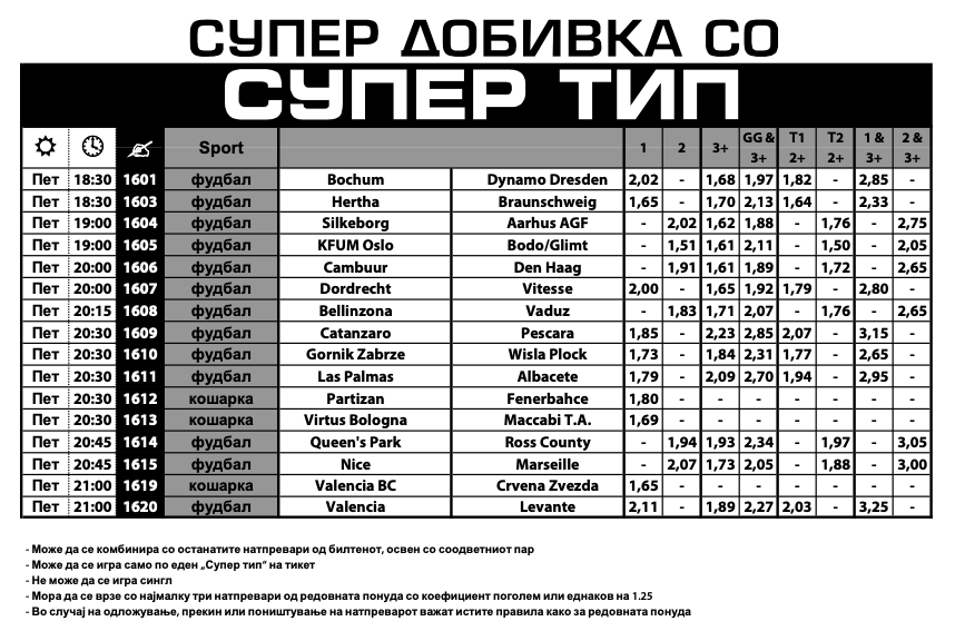 Првиот натпревар од понудата започнува во 18:30 часот, а тоа значи дека имате доволно време да размислите и да ја одберете двојката со која ќе си ја зголемите квотата, а со тоа и добивката на вашите тикети уплатени во Sport Life.