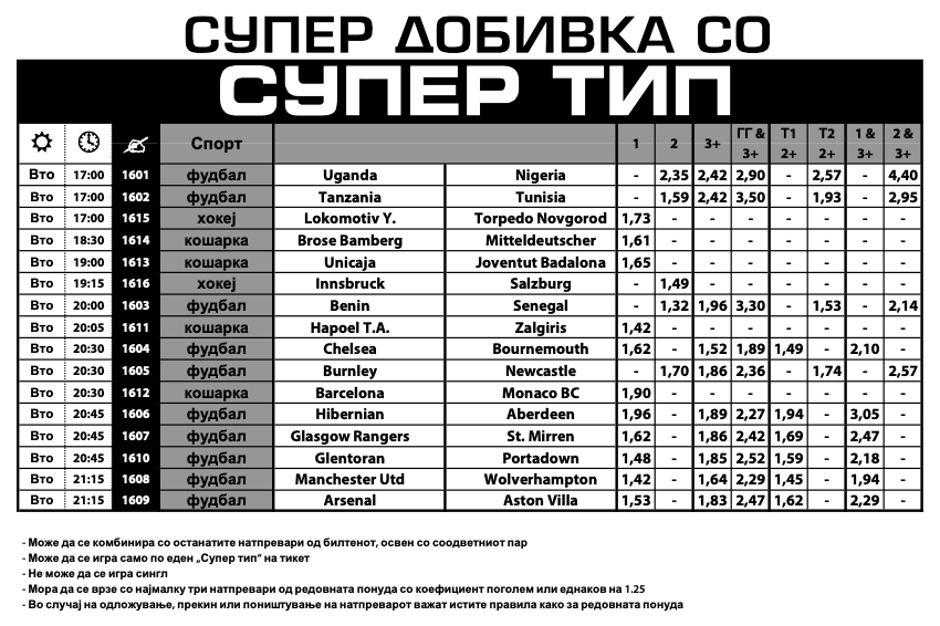Најинтересни се натпреварите од Премиер лигата, па во Супер типот има зголемени квоти за победи на Челзи, Њукасл, Манчестер јунајтед и Арсенал, но и за Глазгов ренџерс, како и за два меча од кошаркарската Евролига.