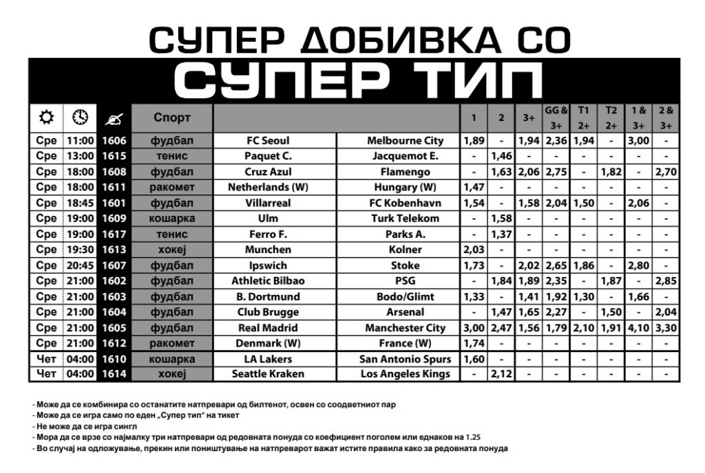 Фудбалот има доминација и оваа среда, меѓутоа Супер типот е максимално разновиден. Присутни се и кошарка, тенис, ракомет и хокеј, се разбира, со зголемени коефициенти.