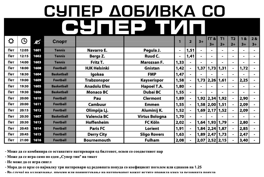 Она што е интересно за фудбалските и кошаркарските натпревари, на сите фаворитската улога ја имаат домашните екипи, а зголемени квоти има и за игри на голови, како и комбинации на голови и конечен тип.