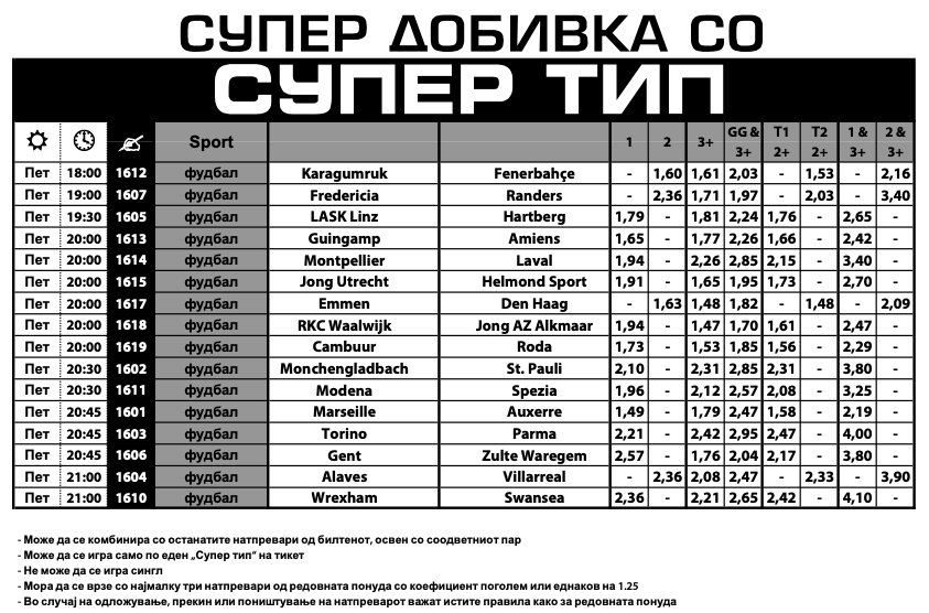 Сите 16 натпревари во понудата со зголемени квоти на Sport Life, Супер типот, се од фудбалот, а тоа е одлична најава за богатиот викенд кој ни престои. Во Супер типот за петок може да се најдат зголемени квоти на вкупно 80 игри, а првиот натпревар започнува во 18 часот, што значи дека имате доволно време да размислите, да го одберете парот со кој ќе ја зголемите добивката на вашите тикети и да ги посетите уплатните места на Sport Life.