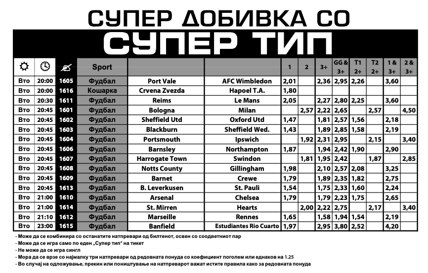Во Супер типот за вторник може да се најдат зголемени квоти за победи на Милан, Леверкузен, Арсенал, Марсеј и уште 11 други натпревари, или вкупно зголемени квоти за 76 игри во Sport Life.