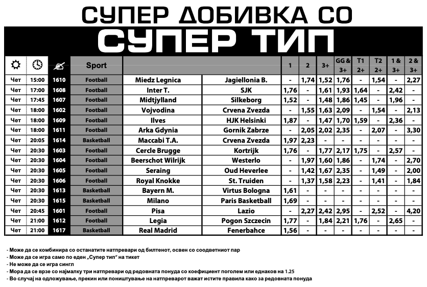 Првиот меч од Супер типот за четврток започнува во 15 часот, а од поинтересните натпревари се издвојуваат зголемените квоти за победи на Црвена ѕвезда и Лацио. Секако, во Супер типот може да се најдат и зголемени квоти и на игрите на голови, „гол-гол и 3+“, како и комбинации од конечен тип и голови.