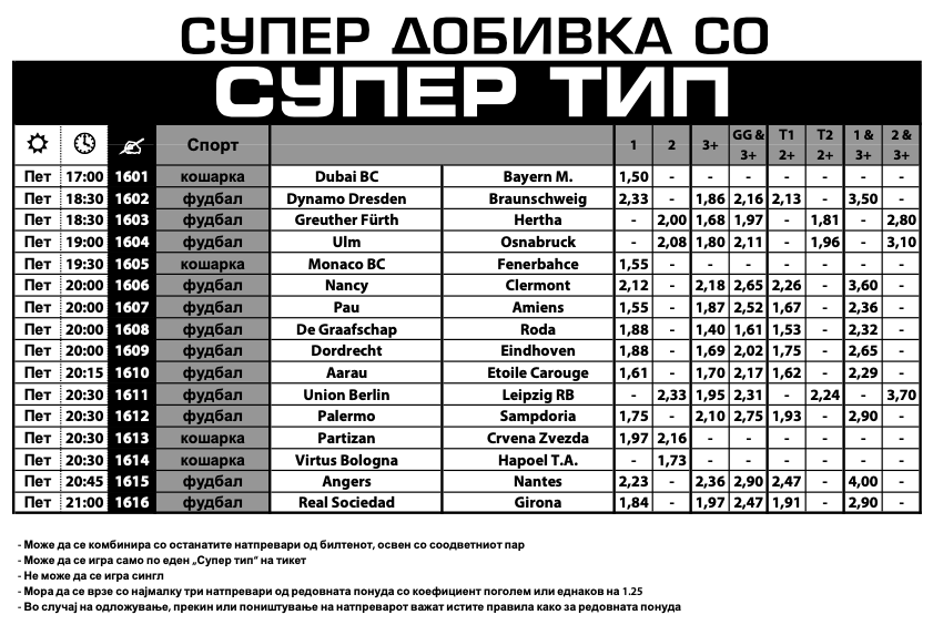 Првиот натпревар од Супер тип понудата започнува во 17 часот, а тоа значи дека имате доволно време да размислите и да го одберете парот со кој ќе ја зголемите добивката на вашите тикети.