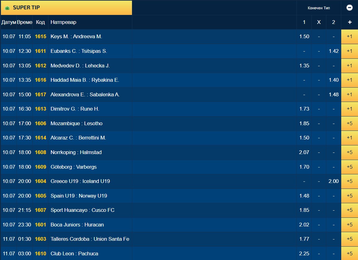 Понудата вообичаено започнува со тенис, и тоа со мечевите од Вимблдон, каде што фаворитската улога ја имаат Моника Кис над Андреева (1.50), Стефанос Циципас над Јубанкс (1.42), Данил Медведев против Лехечка (1.35), Елина Рибакина против Хадад Маиа (1.40), Григор Димитров против Руне (1.73) како и првиот носител Карлос Алкарас против Матео Беретини (1.50).