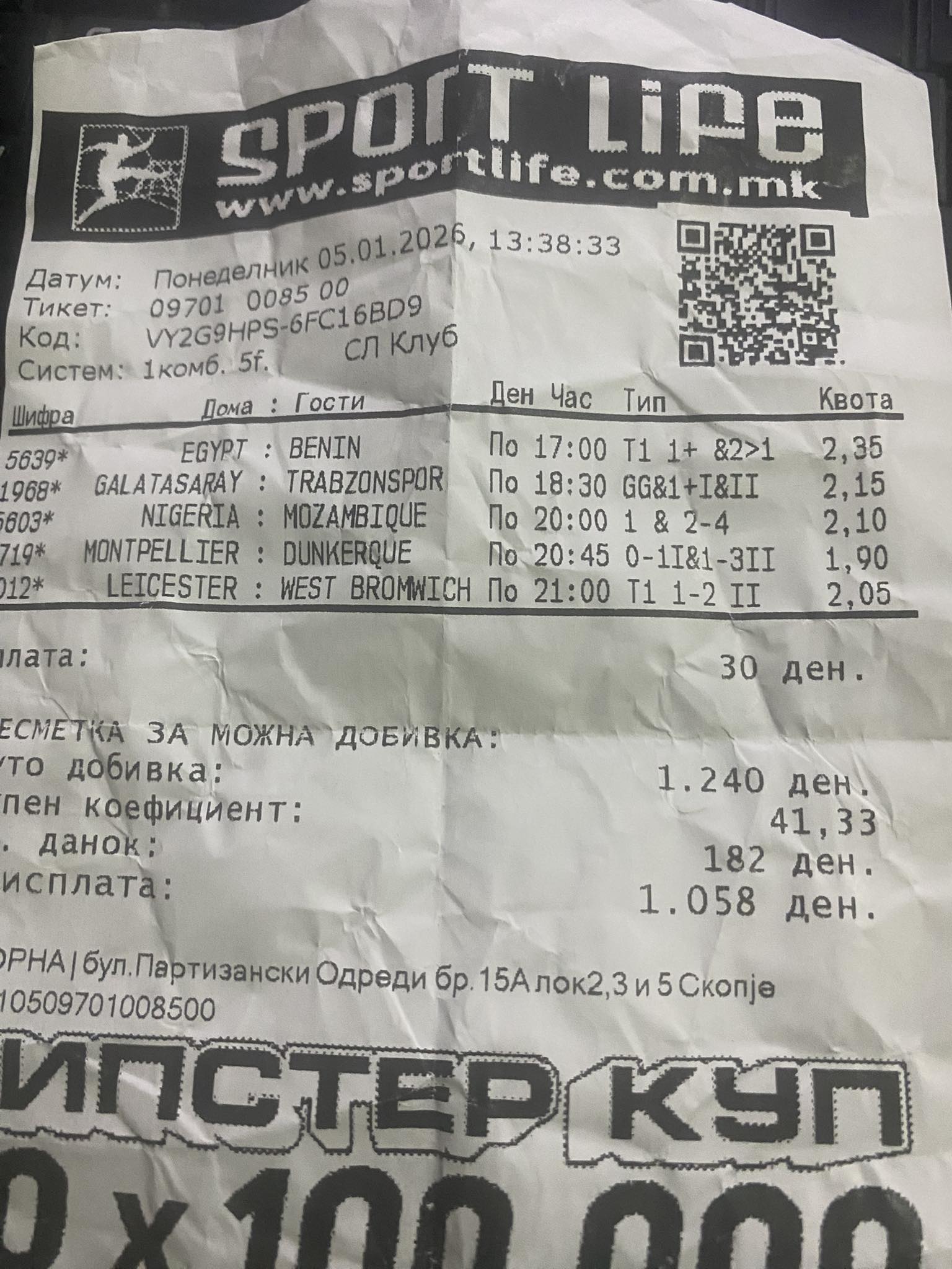 Обложувач од Скопје претчувствувал дека вчерашните квоти на денот во Sport Life може да бидат добитни, и ги уплатил на 30 денари, што носеше можна добивка од над 1.000 денари.