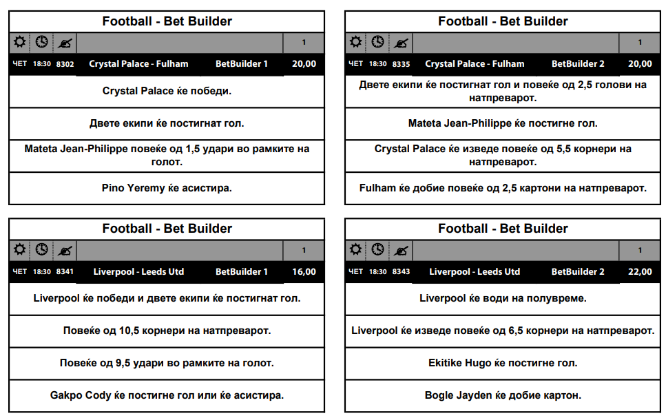 Четири натпревари од Премиерлигата се играат во првиот ден од новата 2026 година, а за сите има по две интересни билдерски комбинации со одлични коефицинети.