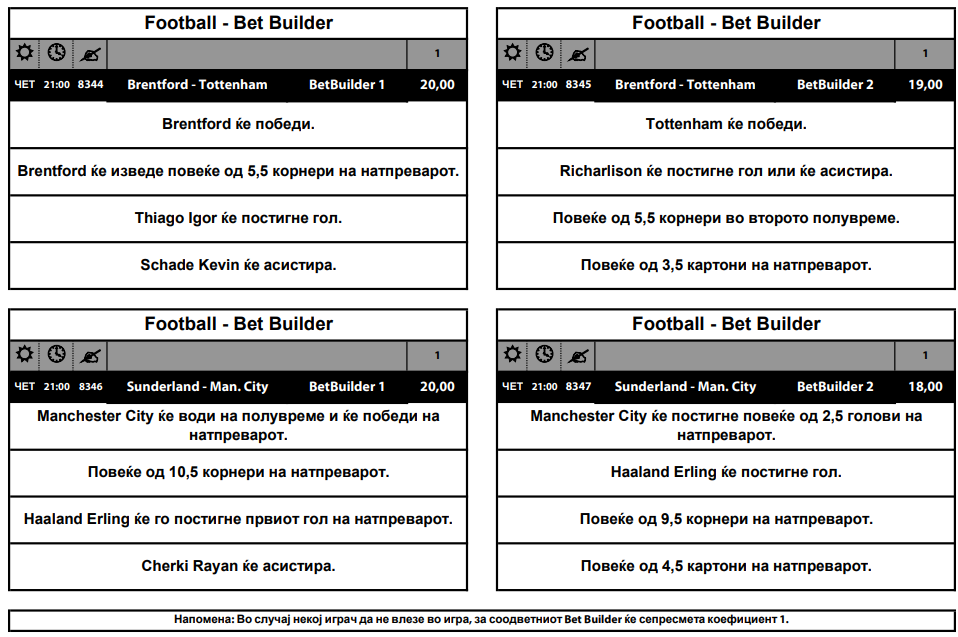 За дуелот меѓу Сандерленд и Манчестер сити има комбинација со коефициент 20, а ќе биде добитна ако: Манчестер сити води на полувреме и победи на крајот, бидат изведени повеќе од 10,5 корнери, Ерлинг Халанд постигне гол и Рајан Черки ќе има асистенција.