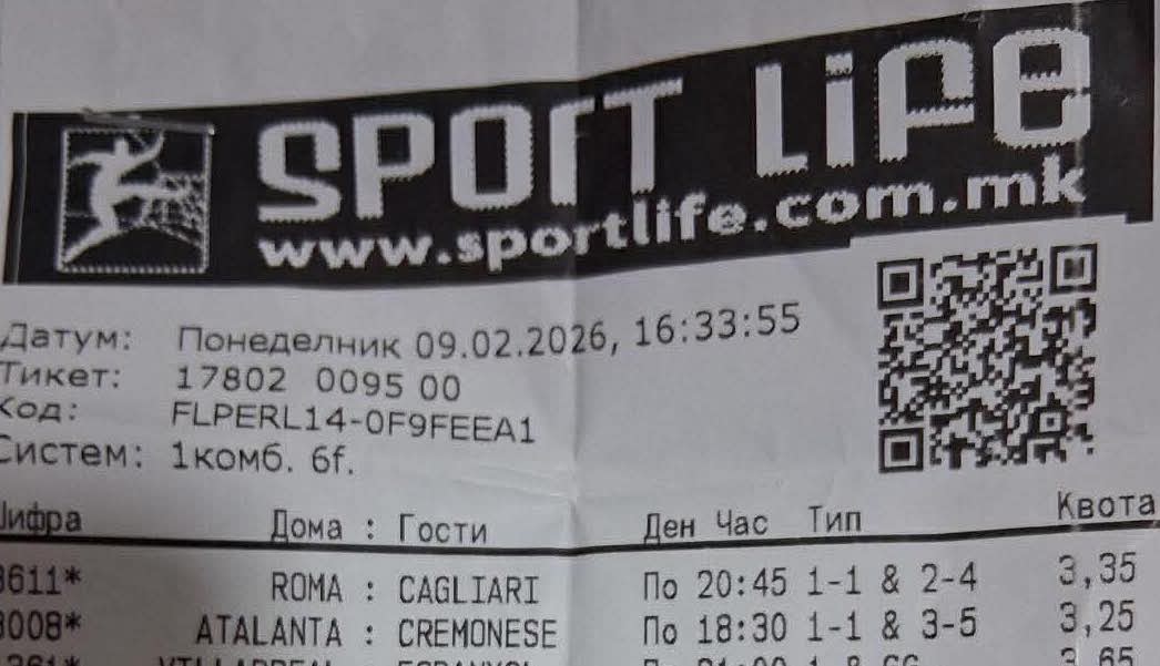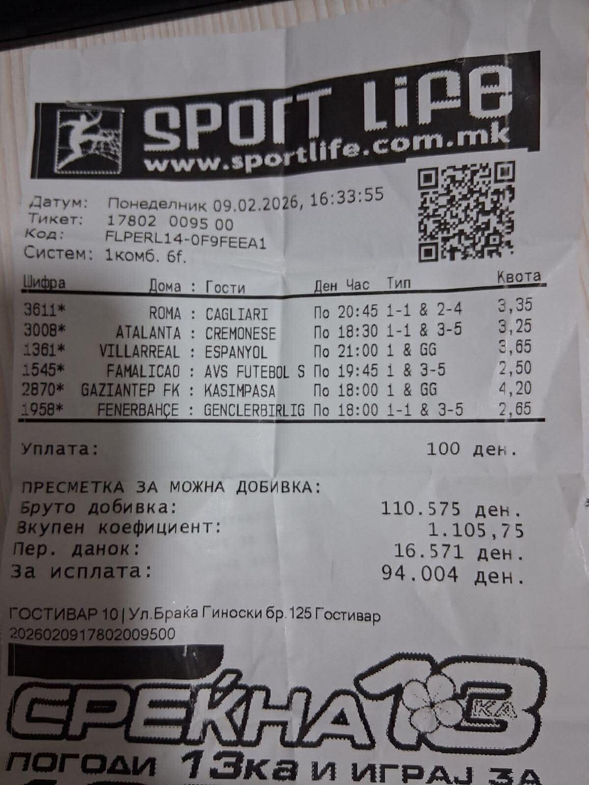 Во Гостивар и шест меча со уплата од само 100 денари беа доволни за одлична добивка од нето сума од 94.004 денари. Клучен беше голот на Кремонезе во 94-тата минута на гостувањето кај Аталанта, со што беа поставени конечните 2-1, а тоа беше доволно за да излезе комбинацијата „1-1 и 2-5“.