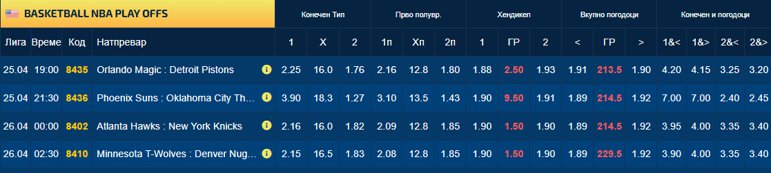 Атланта и Минесота водат со по 2-1 против Њујорк односно Денвер, но квотите велат дека поголеми се шансите после вечерашните мечеви да биде 2-2, отколку 3-1. На потег се Џејлен Брансон и Никола Јокиќ, бидејќи ако нивните тимови не победат вечерва, историјата покажала дека ќе биде многу тешко да се пласираат во следното плејоф коло ако се најдат во негатива од 1-3.