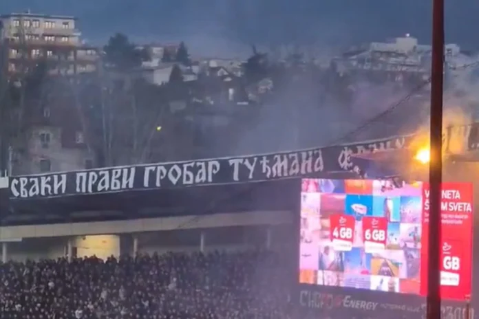 Навивачите на Црвена ѕвезда на кровот каде што беа сместени гостинските навивачи спуштија транспарент на кој пишуваше „Секој прав Гробар го слави Фрањо Туѓман“, со јасна намера да ги навредат.
