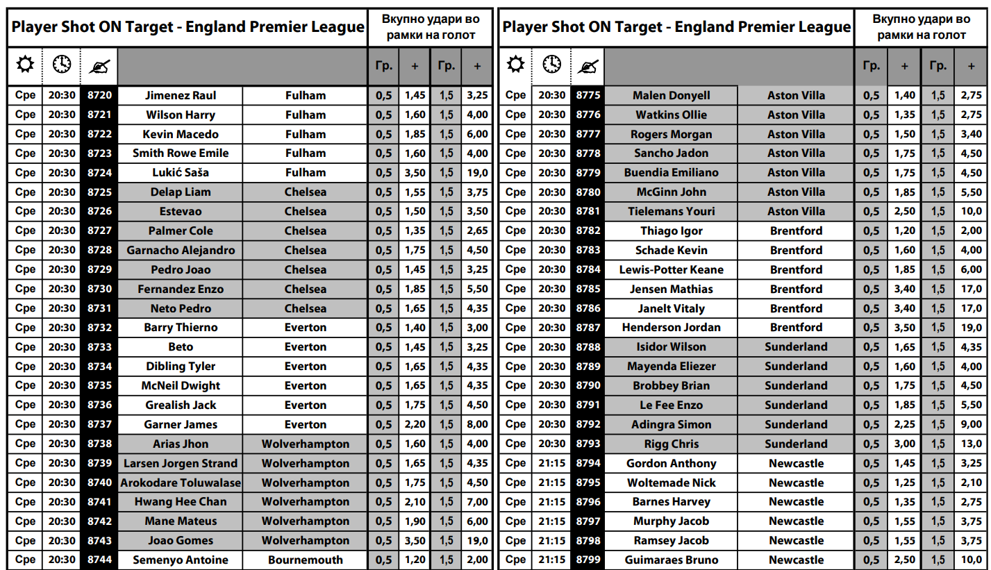 Дури осум натпревари се играат вечерва во англиската Премиер лига, а во понудата на Sport Life има одлична опција за обложување на тоа кои играчи колку шутеви ќе имаат во рамките на голот.