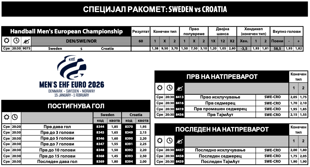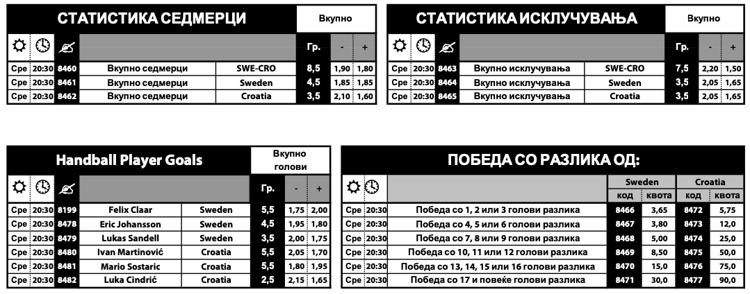Шведска е голем фаворит со квота за победа од 1.38 во понудата на Sport Life, додека триумфот на Коцкестите има квота од 3.70. Селекцијата од Скандинавија победи на последните два меѓусебни меча, а Хрватска чека триумф од 2018 година.