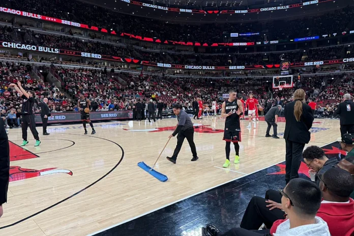 Truly bizarre scenes at United Center tonight. The Bulls – Heat game has been delayed for more than a hour as crews work to clean the court from condensation caused by the torrential downpours outside, warmer temps and high humidity levels. @WGNNews pic.twitter.com/iVi5nuZdzs