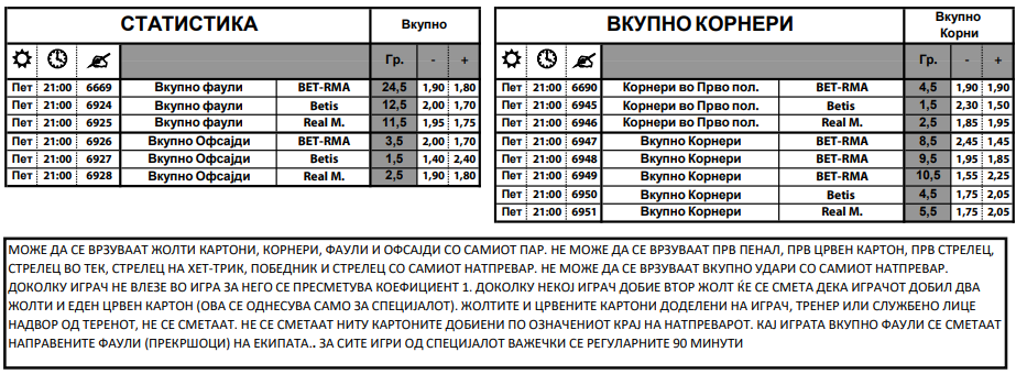 Тука се и комбинациите како што се стрелец на гол и победник на мечот, како и статистичките игри за бројот на изведени корнери, направени фаули, добиени жолти картони, упатени удари во рамките на головите, „уловени“ офсајд-позиции.