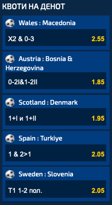Австрија и Босна и Херцеговина играат директен дуел за пласман на Мундијалот, а квотата од 1.85 ќе биде добитна само ако во првото полувреме не бидат постигнати повеќе од два гола, а во второто да има еден или два погодоци.
