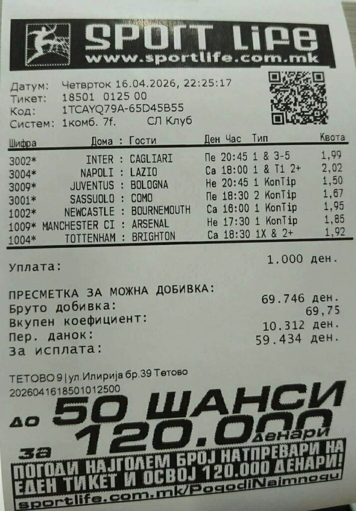 „Секако дека следам европски фудбал. Премиер лигата е најквалитетната и секогаш со внимание и посебна возбуда ги гледам мечевите во Англија. Таму трката за титулата ќе биде максимално интересна, а викендов се игра дербито што може да реши многу работи меѓу Манчестер сити и Арсенал. Не сум некој успешен прогнозер, но ќе се обидам да го погодам хуманитарниот тикет и да донираме финансиски средства таму каде што се најпотребни“, заврши Никола Манојлов.