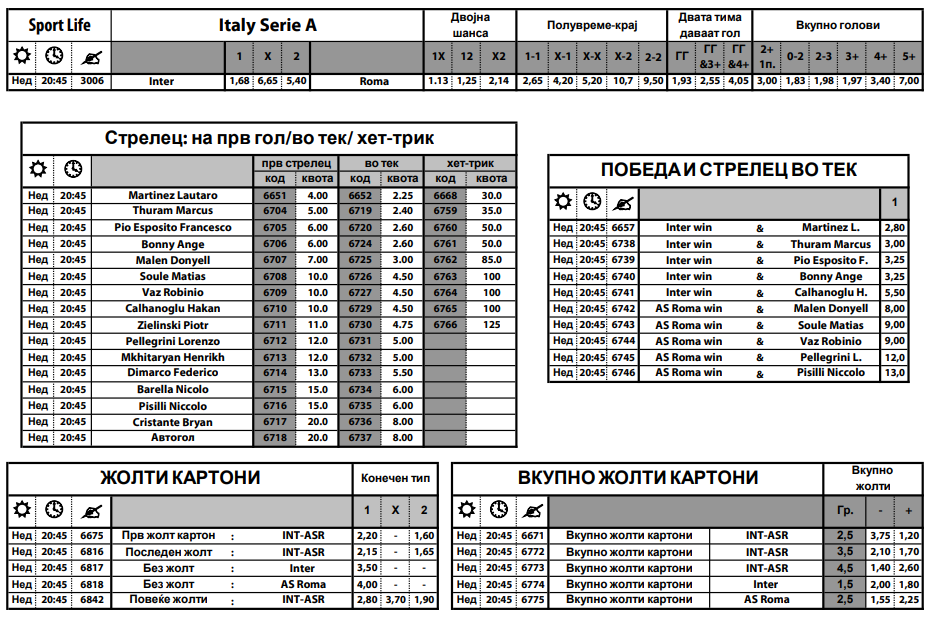 Лаутаро Мартинез е главен фаворит за прв стрелец на погодок, а добра комбинација е дека Аргентинецот ќе даде гол а Интер ќе победи. Вкупно 15 играчи се во понудата за стрелец на погодок, а има и други одлични комбинации. Тука се и статистичките игри, па може да се погаѓа бројот на изведени корнери, шутеви во рамките на голот, направени фаули, добиени жолти картони…