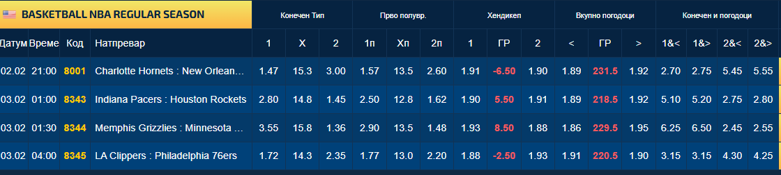 Квотите за конечен тип се многу примамливи бидејќи има фаворити, но нема ептен мали квоти и ако се врзат сите, може да се дојде до солидна добивка. Секако, тука се и уште еден куп игри, а има и листа од 45-мина кошаркари на кои може да одиграте на „плус-минус“ поени.