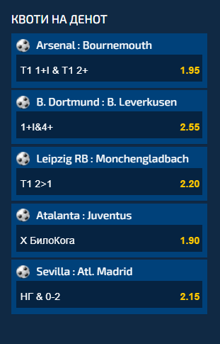 Последниот предлог ќе им се допадне на сите кои мислат дека на Севилја – Атлетико Мадрид нема да има повеќе од два гола, а за добитна квота од 2.15 треба и барем едниот тим да не постигне гол.