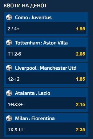 Пет интересни меча од најатрактивните лиги во Европа се дел од Квоти на ден, а ако сите пет понудени комбинации ги одиграте на еден тикет заедно, ќе добиете вкупен коефициент од 37.36.