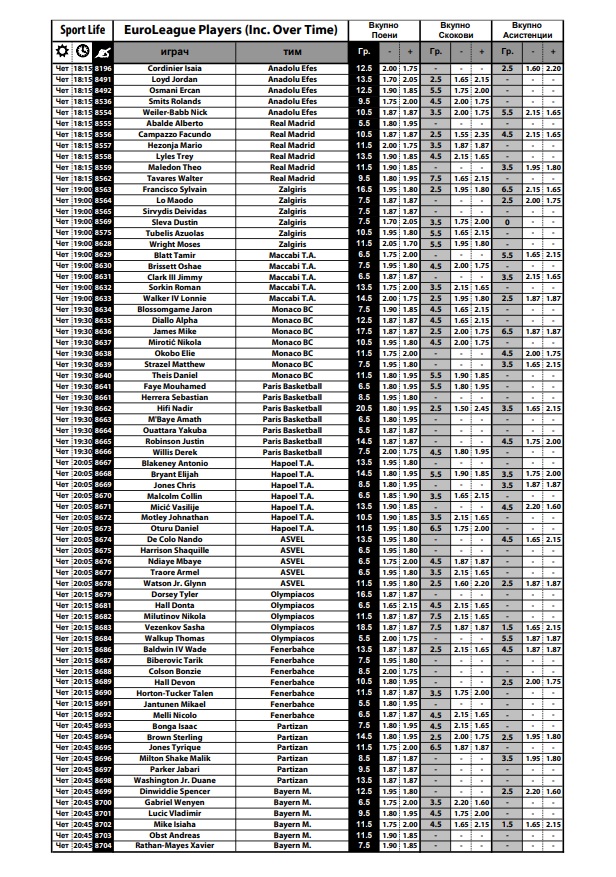 Партизан е умерен фаворит вечерва против Баерн Минхен, а интересно ќе биде на дуелот меѓу Олимпијакос и Фенербахче. Најголем фаворит е Хапоел Тел Авив, кој игра против Асвел.