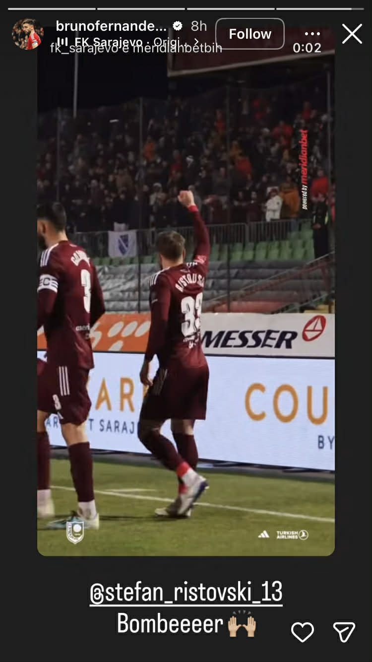 Токму затоа Фернандеш не ретко знае преку социјалните мрежи да даде поддршка за Ристовски и да го пофали за некој негов постигнат гол, како што беше тоа вчера. Португалската ѕвезда на својот инстаграм профил го стави погодокот на Ристовски и упати пофални зборови за некогашниот соиграч.