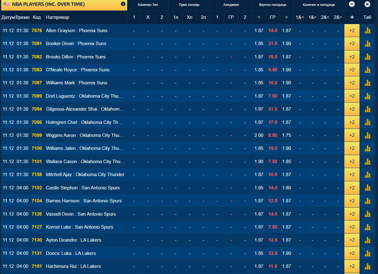 Во понудата има и 24 кошаркари кои ќе бидат дел од „плус-минус“ играта. Лука Дончиќ треба да биде прва опција во нападот на Лејкерс и е на граница од 33,5 поени за да биде во плус, додека Леброн Џејмс е на граница од 18,5 поени. За Шеј Гилџес Александер границата е на 31,5 поени.