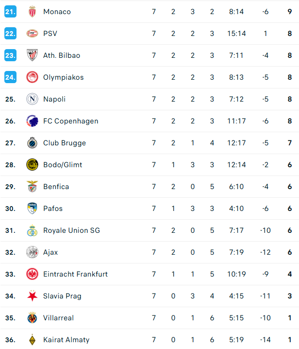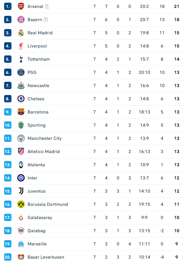Тотенхем е на петтото место со 14 бода, а потоа следува нешто што ретко се гледало досега. Дури осум екипи имаат по 13 бода, а тоа се: ПСЖ, Њукасл, Челзи, Барселона, Спортинг, Манчестер сити, Атлетико Мадрид и Аталанта и тие се поредени од шестото до 13-тото место.