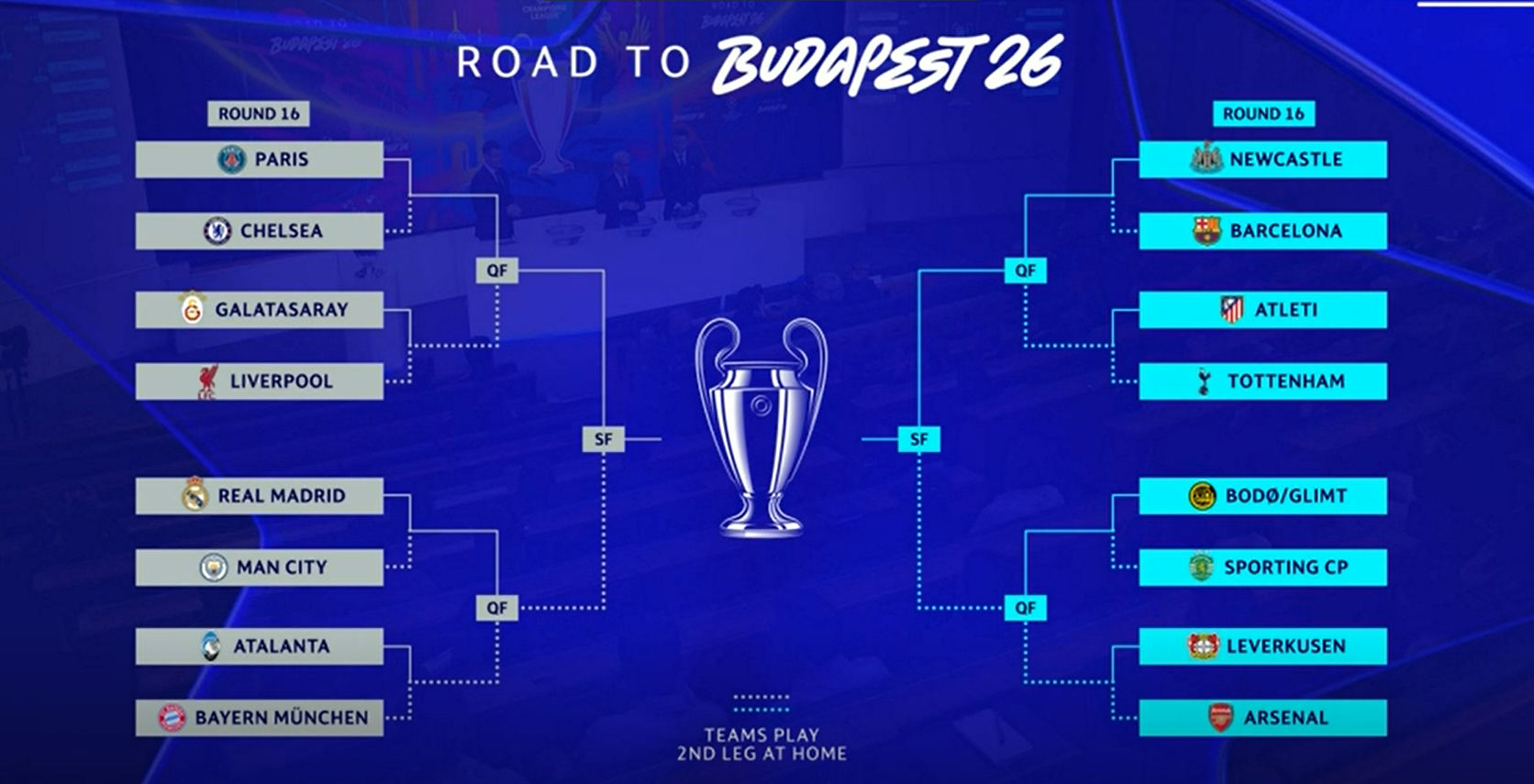 Останатите парови се Бодо/Глимт – Спортинг Лисабон, Њукасл – Барселона, Галатасарај – Ливерпул, Атлетико Мадрид – Тотенхем, Аталанта – Баерн и Баер Леверкузен – Арсенал.