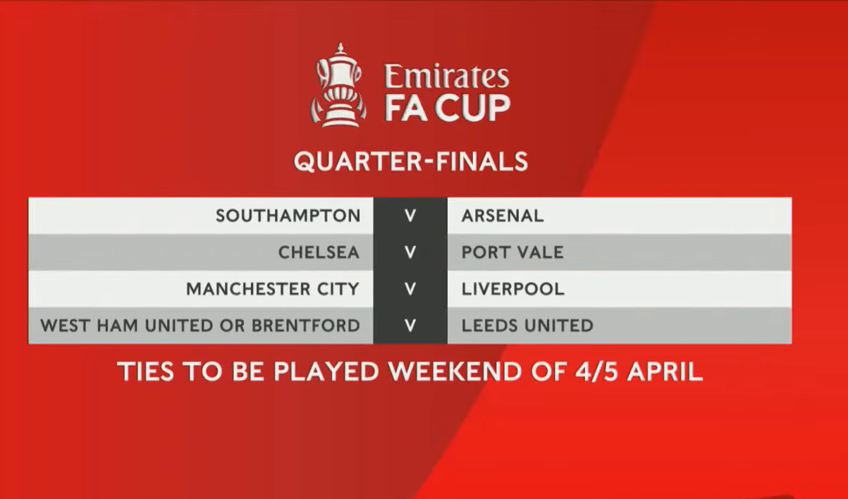 Најголема среќа во ждрепката имаше тимот на Челзи, кој ќе игра на својот „Стемфорд бриџ“, и тоа против третолигашот Порт Вејл. Лидерот во Премиер лигата, тимот на Арсенал ќе гостува кај Саутхемптон, додека Лидс ќе гостува кај подобриот од дуелот меѓу Вест хем и Брентфорд.