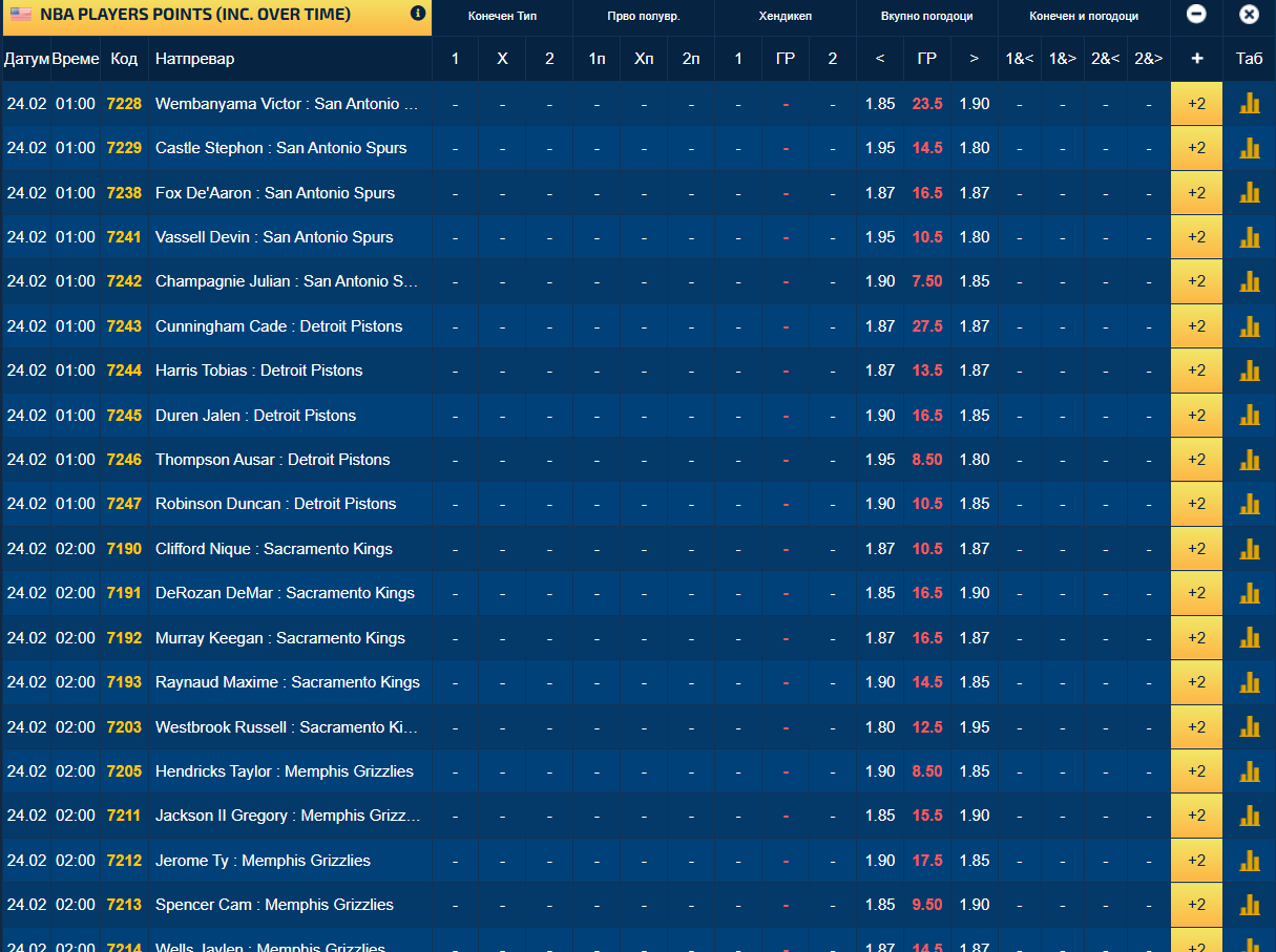 Во понудата има и над 30-мина кошаркари за играта „плус-минус“ поени. За Виктор Вамбањама границата е на 23,5 поени, а Кевин Дурант да биде „во плус“, мора да постигне над 27,5 поени.