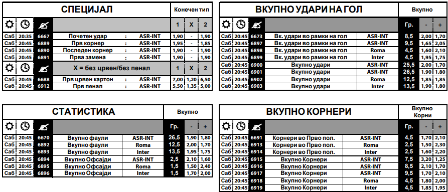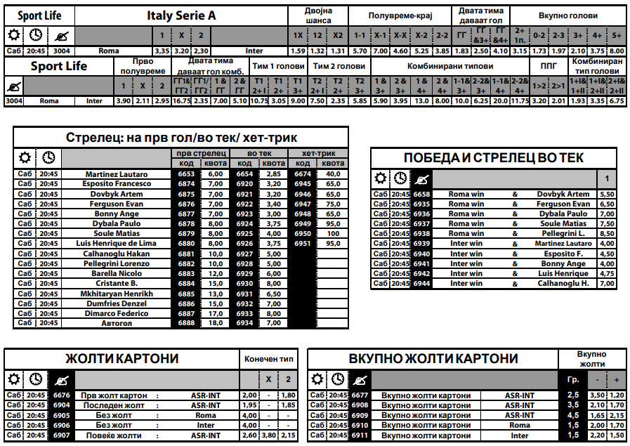 Во дерби пресметката во Серија А, Интер како гостин е фаворит за победа, но Рома кога игра дома, секогаш има адут плус да изненади. Лаутаро Мартинез, Франческо Еспозито, Артем Довбик и Еван Фергусон се меѓу главните опции за стрелец на првиот гол и воопшто да се запишат во листата на стрелци на ова дерби.