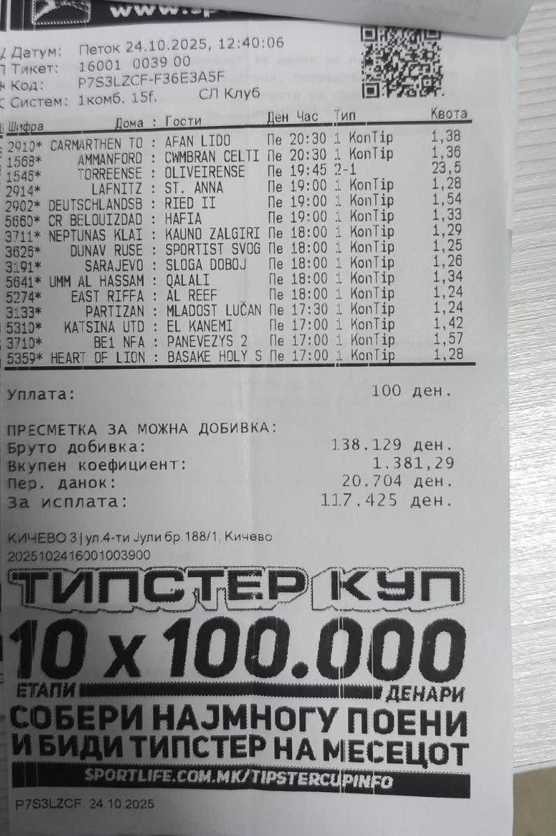 Погодени се 14 исходи на фудбалски мечеви низ Европа кои се играа вчера. Радовишанецот синоќа последно за супер добивка чекал на Лион – Стразбур да има три или повеќе голови. Веќе во 31-ва минута имаше два гола, но потоа Лион утна пенал и резултатот 1-1 важеше до 91-ва минута. Тогаш Афонсо Мореира даде гол за Лион за да излезе добитен тикетот на кој најголема поединечна квота е 2.40.