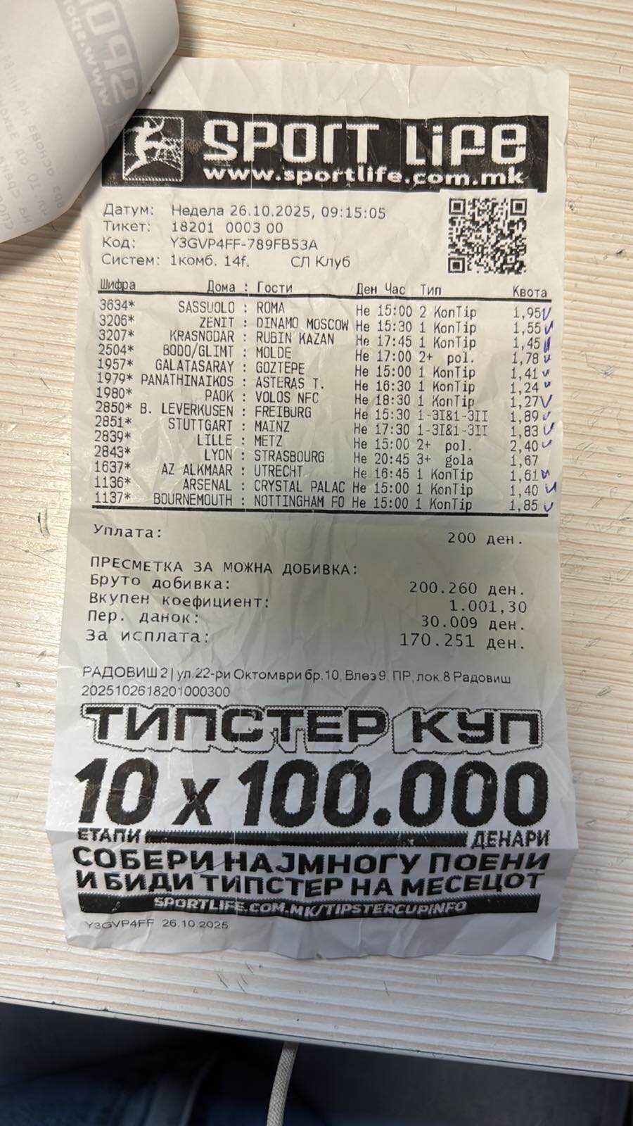 Во Sport Life во Радовиш, уплатен е тикет кој излезе добитен, а квотата му е 1.001, па со 200 денари уплата, бруто добивката е 200 илјади.