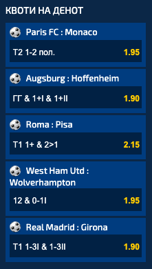 Пет натпревари од топ-5 лигите се дел од понудата со Квотите на денот во Sport Life. Вкупната квота на петте предлози е 29.5, додека поединечно квотите се движат помеѓу 1.90 и 2.15.