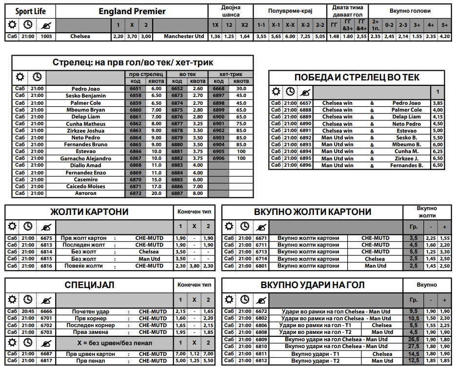 Во последните шест пресметки имало дури четири пенали, а Бруно Фернандеш има постигнато четири погодоци, од кои два пати бил стрелец на првиот гол. Во специјаланта понуда може да се одигра за прв стрелец на гол, потоа стрелец во тек на меч, како и комбинација за тоа кој играч ќе даде гол и кој тим ќе победи.