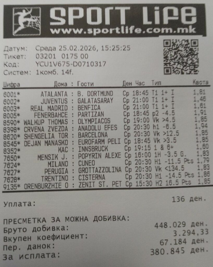 Средата беше неверојатно среќен ден за еден обложувач во Sport Life, кој успеа со уплата само од 136 денари да оствари фантастична добивка од над 6.000 евра, или поточно 380.845 денари.