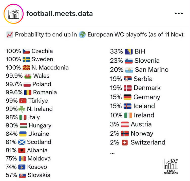 Инетресно е дека најслаборангираната репрезентација во светот Сан Марино има 20 отсто шанси да игра во баражот, а тука е и Србија со 19 отсто шанса да игра во баражот за пласман на завршницата.