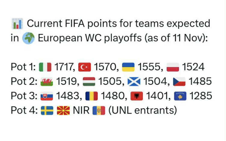 Тоа значи дека Македонија ќе игра со некоја од првиот барабан каде што се најсилните и најдоброрангираните национални тимови, а таму се: Италија, Турција, Украина и Полска.