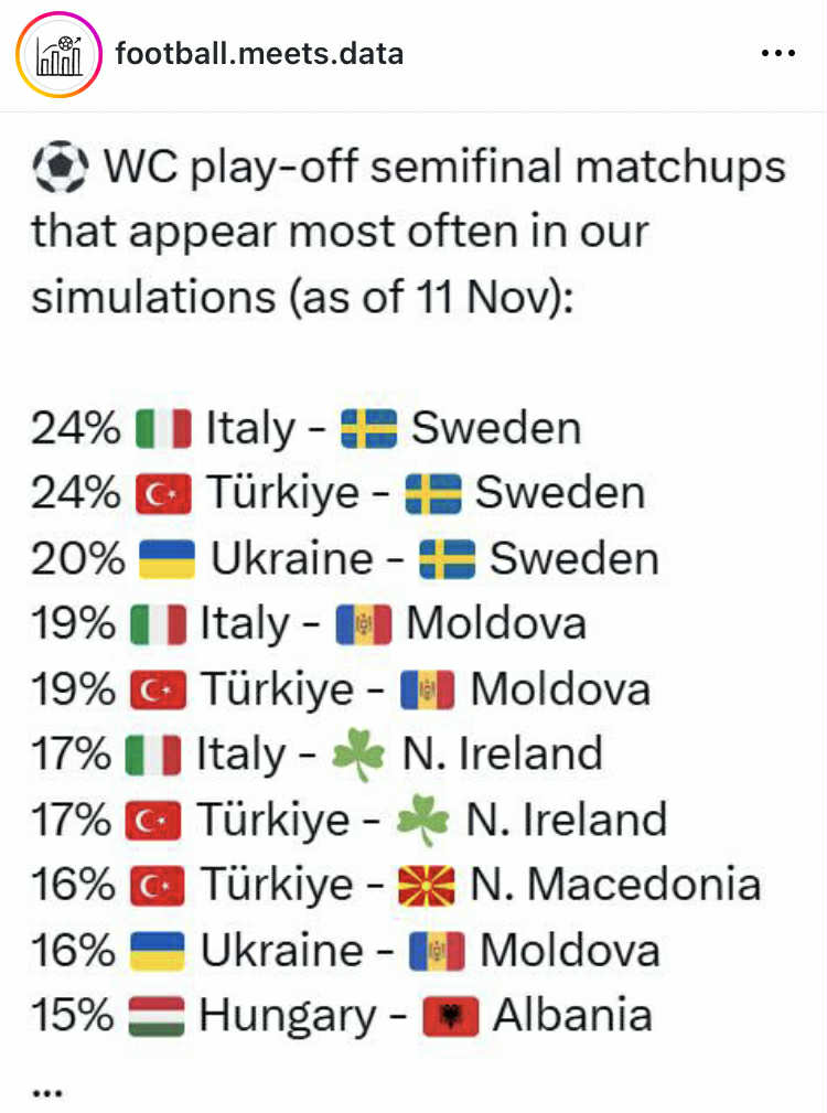 По најправените симулации, во полуфиналето од баражот за пласман на Мундијалот, има 16 отсто шанси Македонија да игра против Турција. Други калкулации покажуваат дека Италија повторно ќе биде ривалот на Македонија во баражот, како тоа што беше во 2022 година. Тогаш Македонија во Палермо ја елиминираше Италија со 1:0, а потоа нашата селекција во финалето на баражот загуби од Португалија со 2:0 и не успеа да обезбеди историски прв палсман на завршницата на планетарниот собир.