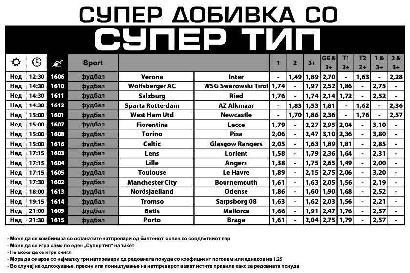 Првиот натпревар започнува веќе во 12:30 часот, а тоа е оној помеѓу Верона и Интер во италијанската Серија А. Од поинтересните натпревари во понудата се и двата премиерлигашки дуели, на кои се очекуваат победи на Њукасл и Манчестер сити, но и мечот на Фиорентина и Лече.