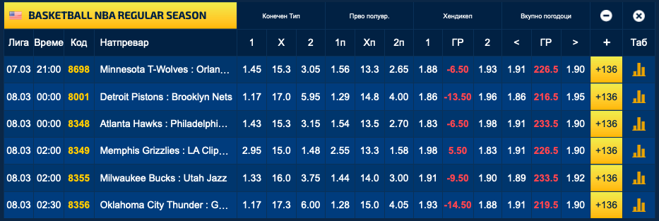 На пет од шестте меча фаворити се домашните екипи, додека честа на гостите треба да ја спаси ЛА Клиперс со победа кај Мемфис. Според квотите во Sport Life, најголеми фаворити за победа се Детроит и Оклахома, со квоти од по 1.17 во дуелите против Бруклин, односно Голден стејт.
