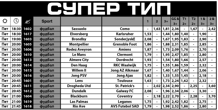 Супер типот на Sport Life за денеска е пребогат, има дури 80 зголемени квоти, по пет опции за 16 натпревари кои се играат вечерва низ фудбалските терени во Европа.
