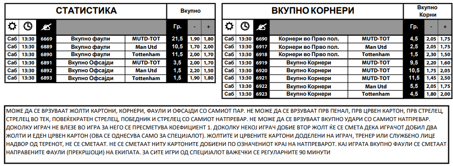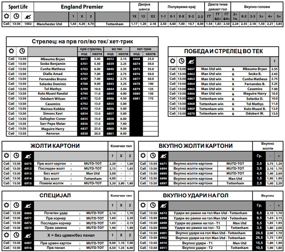 Покрај многуте понуди за стрелец на гол, тука е и комбинацијата за победа на тимот и стрелец, па тама Мбеумо да погоди, а Манчестер да победи е со квота од 2.55, додека комбинацијата домаќините да се радуваат, а Матеус Куња да даде гол е со 2.75. Дури 10 квота е Тотенхем да се радува, а Соланке да биде стрелец на гол.