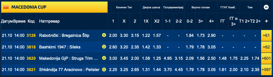 Второлигашот има квота од 2.25 за победа, додека Пелистер има квота од 2.65 за пласман во четвртфиналето.