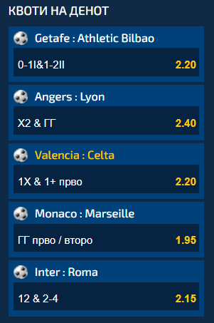 Пет меча од најсилните европски лиги се дел од денешната понуда во Квоти на ден, а ако сите понудени комбинации се одиграат на еден тикет, вкупниот коефицинет кој ќе го добиете е одличен и изненсува 48.7.