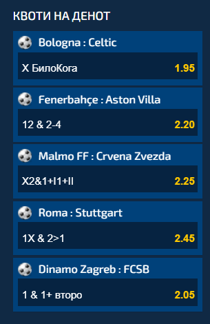 Пет меча кои се на програмата во Лигата на Европа се дел од Квотите на денот во Sport Life. Доколку сите пет комбинации ги одиграте заедно на еден тикет, вкупниот коефицинет е 48,47.