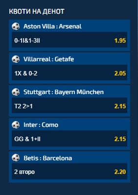 Првиот предлог е дуелот од Премиер лигата меѓу Астон Вила и Арсенал. Квотата на денот е 1.95, ако во првото полувреме има најмногу еден гол, а во второто – од еден до три гола.